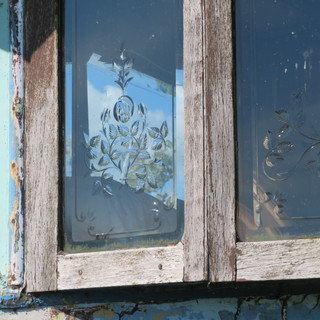 We headed down toward the house and crossed the water here. This led us once more to an uphill track which even though was good track, was tough with the increasing heat. On the following downhill, the dodgy knee kicked in (it's only ever downhills 🤷🏻♀️) so we stopped to put the knee brace on and continued past a beautiful old coach. I was fascinated by the ornate glass in the windows.